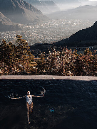 Blick auf das Bozner Lichtermeer, das Etschtal und die Dolomiten – von Terrassen, Pool und vielen Suiten.