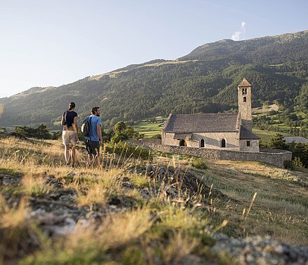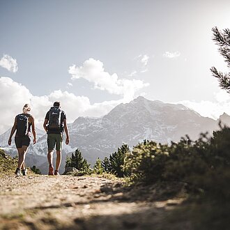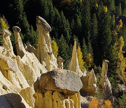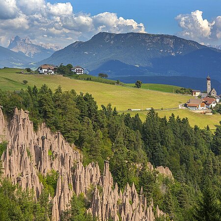 Die Tour startet am Hotel, führt an den Erdpyramiden vorbei und zur Tschaufer Nock, eine majestätische Felsformation mit Blick auf das Etschtal und die gegenüberliegenden Berggruppen.