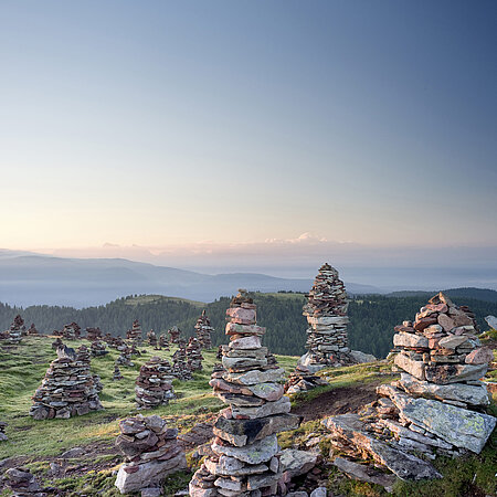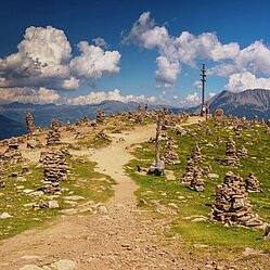 Begleitet von einem 360-Grad-Blick fahren Sie von Ihrem Bike-Hotel bei Bozen zu den Stoanernen Mandlen auf 2.000 Höhenmetern – ein sagenumwobener Platz mit über 100 Steingestalten.