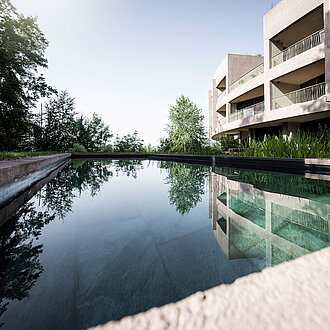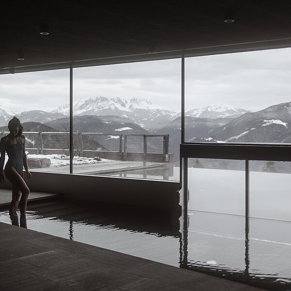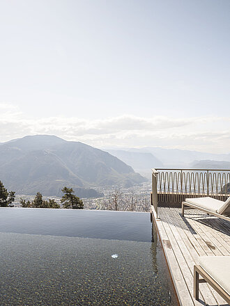 Lassen Sie sich fallen und geben Sie jeglichen Ballast an das warme Wasser ab. Im Infinity Pool und im Outdoor-Whirlpool reicht der Blick bis in die Dolomiten gegenüber. Im naturreinen Wasser des Biopools lässt sich der Alltagsstaub von der Seele waschen.