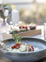 Um einen Ort wie das Belvedere zu schaffen, bedarf es jemanden, der auf die kleinen Dinge achtet. Aber auch jemanden, der das große Ganze nie aus den Augen verliert. Renate und Hans ergänzen sich in dieser Hinsicht perfekt. Renate hat für ihre Gäste stets ein offenes Ohr – und einen Wandertipp parat. Es heißt, sie kennt jede Ecke Jenesiens, die allermeisten Wanderwege und beinahe jedes schöne Geschäft in Bozen. In denen findet sie auch die Blumen für die einzigartige Dekoration im ganzen Hotel. Hans, ein ehemaliger Münchner Arzt und Quereinsteiger, waltet und gestaltet vor allem im Hintergrund und unterstützt seine Frau in allen organisatorischen Belangen.