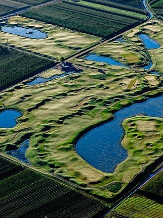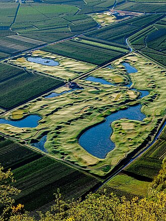 Aufgrund seiner vielen Wasserhindernisse nennt sich der 9-Loch-Platz in Eppan auch „Blue Monster“. Auf Südtirols jüngstem Golfplatz mit seinen hohen Roughs kommt in der ehemaligen Auenlandschaft des Etschtals sogar ein echtes „Links-Course-Feeling“ auf.
