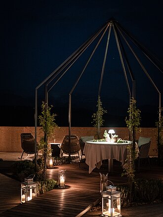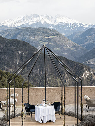 Ob ein romantischer Heiratsantrag, ein intimes Candle-Light-Dinner oder eine stilvolle Feier, der Sky Pavillon ist Ihr Logenplatz für die schönsten Augenblicke im Leben. Die absolute Krönung für Ihren Pärchenurlaub oder Ihr romantisches Wochenende in Südtirol – mit spektakulärem Blick auf die Dolomiten.