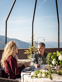 Genießen Sie ein exklusives 5-Gänge-Gourmetmenü, kreiert von unserem Küchenchef Christian Reiterer und seinem Team, während die Lichter von Bozen funkeln und die Dolomiten in der Abenddämmerung leuchten. Perfekt für alle, die sich im Pärchenurlaub in Südtirol noch ein Stück mehr Privacy und Zweisamkeit wünschen.