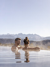 Von Leichtigkeit getragen, schwimmen Sie von innen nach außen. Bis zum Horizont. Wo sich Gedanken verlieren und wieder entstehen. Das Dolomitenpanorama im Infinity Pool raubt einem den Atem und kann zu jeder Jahreszeit bewundert werden. Wer sich hier zwischen Himmel und Erde treiben lässt, ist weit weg vom Alltag und ganz da im Moment. Ziehen Sie bereits vor dem Frühstück Ihre Bahnen oder beobachten Sie am frühen Abend, wie sich die Sonne langsam hinter den Gipfeln versteckt und die herannahende Nacht den Talkessel funkeln lässt. Lust auf eine Unterwassermassage? Dann lockern Sie Ihre Muskeln mit den Massagedüsen im 34 °C warmen Außen-Whirlpool.
