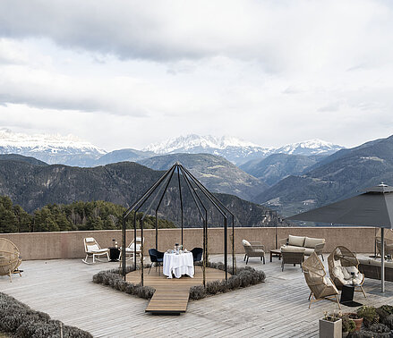 Erholungsfreiraum im Innen- und Außenbereich mit Endlosblick in die Dolomiten.