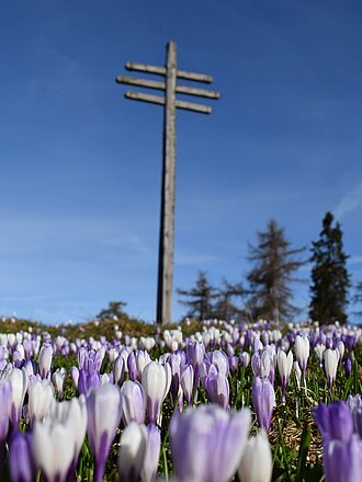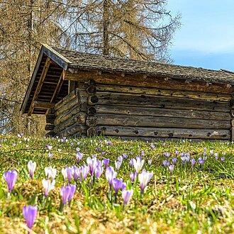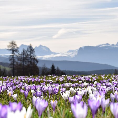 Mit Krokussen übersäte Wiesen und schneeweiße Dolomitenspitzen im Hintergrund: Genießen Sie die Augenweide an Farbtupfern am Naturparadies des Salten.