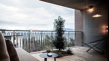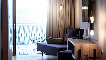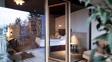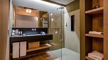 Clean lines, frameless floor-to-ceiling windows, fine wooden floors and handpicked materials define the architectural clarity of this hillside Junior Suite – honoured with the best architects award. A striking modern bathroom, in some cases en-suite, adds a bold interior accent, while the spacious 2x2 m sommier bed invites you to linger in a space where openness meets warmth.