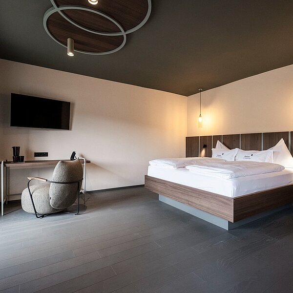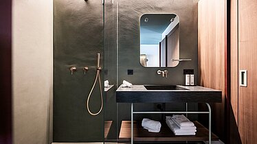 Unisce uno stile essenziale a un arredamento esclusivo: il caldo legno di noce, la pietra serpentino, il raffinato pavimento in resina dai riflessi verdastri e i soffici letti sommier creano un rifugio armonioso. Sul balcone o terrazzo privato esposto a nord-est, la prima luce del giorno accarezza corpo e mente allo stesso modo.