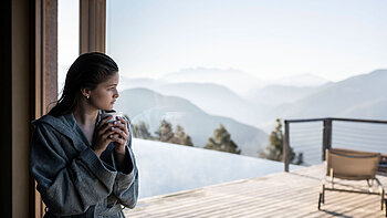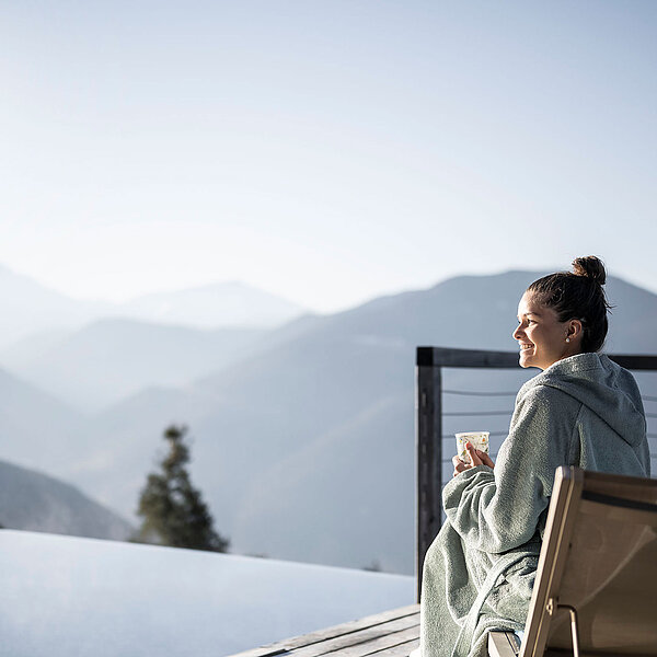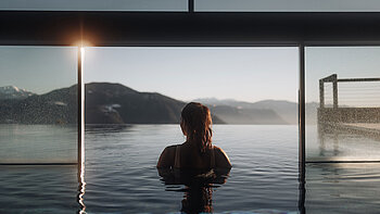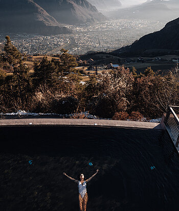 E poi c'è questo posto speciale: la vasca idromassaggio sulla terrazza panoramica. È uno di quei luoghi in cui la quotidianità non conta più. Qui, tra l’acqua calda e l’aria fresca, i pensieri svaniscono, lasciando solo una sensazione di felicità. L'acqua a 36 gradi, combinata con massaggi sott'acqua delicati, scioglie ogni tensione. Diventa particolarmente magico al tramonto: quando il sole scompare dietro le cime del Latemar e del Catinaccio e la città si trasforma in un diamante scintillante. Vivi questa esperienza in un hotel in Alto Adige con piscina esterna riscaldata!