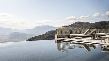 Se cerchi un hotel con piscina a Bolzano, l'Hotel Belvedere a San Genesio non solo ti sorprenderà, ma ti incanterà. A 1.100 metri di altitudine, lontano dal caos quotidiano, l'architettura e la natura si fondono in modo unico. Le tre piscine dell’hotel offrono un’esperienza senza pari. Vuoi immergerti in uno dei più spettacolari Infinity Pool dell’Alto Adige? Rilassarti nel whirlpool ammirando le Dolomiti? Oppure desideri un hotel a Bolzano con piscina esterna riscaldata? Qui potrai immergerti nel mondo acquatico variegato del Belvedere!
